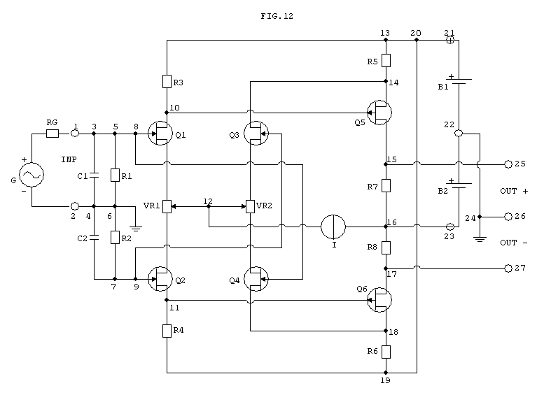 FIG.11 shows the simplified version of those type of circuits that, also maintaining the same FIG.1 principle's structure, have a minimal number of components. This simplified version of the circuit object of application, present dual power supply batteries (B1, B2) or equivalent, six active devices of amplification (Q1, Q2, Q3, Q4, Q5, Q6) including bipolar transistors (BJT) or unipolar transistors (JFET, VFET, MOSFET, SIT and the like), one constant current source (I), two trimmers (VR1, VR2) two input resistors (R1, R2), two capacitors (C1, C2), six load resistors (R3,R4,R5,R6,R7,R8), two signal input terminals (1-2), three output terminals (25-26-27), three power supply terminals (21-22-23). A signal generator (G) is applied with the polarity shown between the terminals 1 and 2 while the signal supplied to the utilizer is taken between terminals 25-26 for the positive phase and 26-27 for the negative phase, being 26 the common ground terminal. For FIG.11, ( and following FIG.12 and FIG.13), we define these features: 1. transistor Q1 = Q2 = Q3 = Q4 ; 2. transistor Q5 = Q6; 3. resistor R3 = R4; 4. resistor R5 = R6; 5. resistor R7 = R8; 6. resistor R2 = R1// RG Referring to FIG.11, it is observed that the bases of Q1 and Q4 are connected, through nodes 8,5,3 and terminal 1, to the positive phase of signal generator G, while the bases of Q2 and Q3, through nodes 9, 7, resistor R2 and node 6, to the ground signal. At the same ground, through terminal 2 and nodes 4 and 6, is connected the other end of the signal generator G (the negative phase). Consequently, we can observe that the network in which are inserted the aforesaid transistors Q1, Q2, Q3,Q4 form a multiple differential amplifier. In particular we can see two vertical differential amps of which the first formed by the pair Q1,Q2 and the second formed by the pair Q3,Q4. At the same time with the same network and the same four devices we can see also two horizontal differential amplifiers, of which the upper formed by Q1,Q3 and the bottom formed by the pair Q2,Q4. In addition, for the created network, there are two further simple differential amplifiers the first of which formats by transistor Q5 (for the upper branch) and the other by Q6 (for the lower branch); Q1 collector through node 10 is connected to base of Q5, Q3 collector to emitter of Q5 through node 14, and, on the lower branch, collector of Q2 through node 11 is connected to base of Q6, while collector of Q4 is connected to emitter of Q6 through node 18; finally, collector of Q5 through node 15 is wired to output terminal 25 and collector of Q6 via node 17 is connected to output terminal 27; terminal 26 connected to ground through node 24 is also the reference for the output signals present on terminals 25 and 27. Applying a signal between input terminals 1, 2, with the polarities as indicated we obtain two signals equally amplified in voltage on collectors of transistors Q1 and Q4 (nodes 10, 18), with negative phase, which we will call signal (A), while on both collectors of transistors Q2 and Q3 we get two equal signals also amplified in voltage (generally a bit different from the first), with positive phase, which we will call signal (B) (nodes 11, 14). It follows that base of Q5 receives a signal (A) identical to that received from emitter of Q6, while emitter of Q5 receive a signal (B) identical to that received from base of Q6. Forming each of said transistors Q5 and Q6 a differential circuits where the amplification coefficient is proportional to the sum of the signals (A) and (B) present on the respective bases and emitters, it follows that the signals on the collectors of transistors Q5 and Q6 (and then on the outputs 25 and 27) will be amplified at the same level of amplitude but with opposite phases. It is also noted, as a result of the circuit’s symmetry, that the frequency response, the output impedance and any other parameter of the two signals provided are very coincident. For the same reason, this proposed circuit can also boast of a good external noise rejection and a good behavior against power supply noise, as well as a low intrinsic distortion. A further advantage, compared to existing phase-inverters, is the not negligible property of being able to be free of DC voltage (offset) at its outputs, which obviates use of capacitors between its outputs and user equipments.